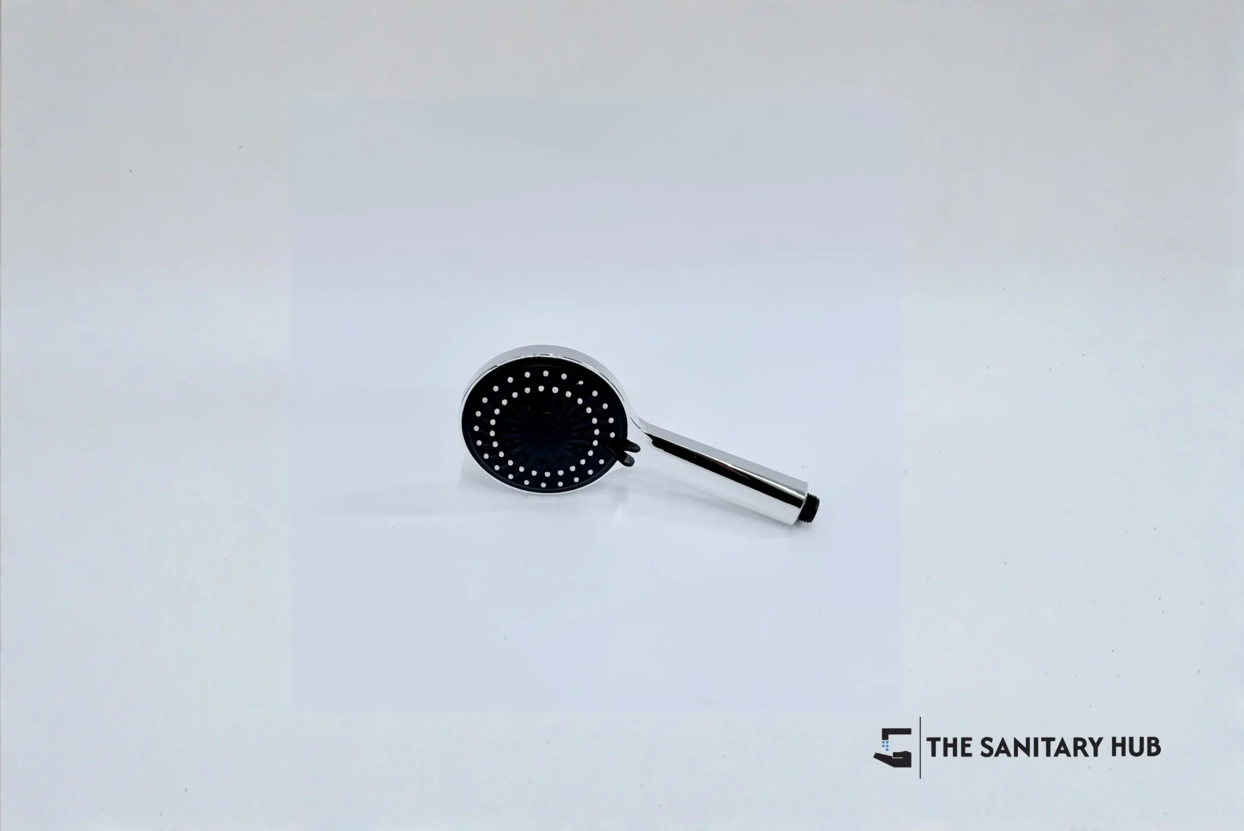 Handheld shower head with chrome finish and wide spray face. Provides even water flow, easy installation, and a modern bathroom look.