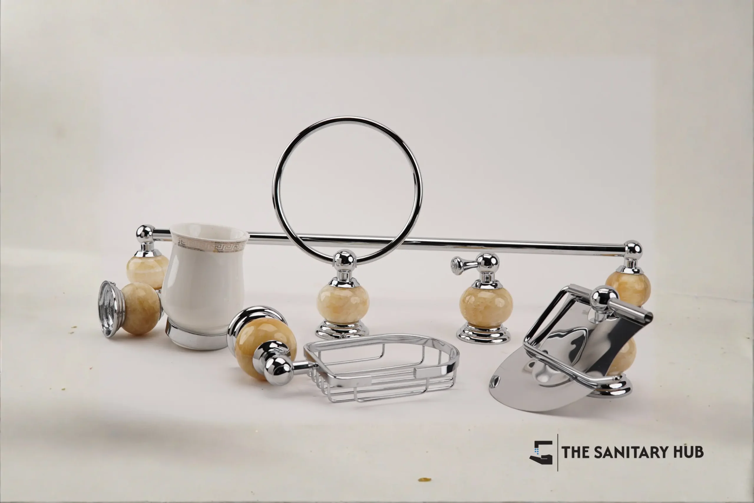 طقم إكسسوارات حمام فاخر مكوّن من 5 قطع بتشطيب نيكل مع تفاصيل من الحجر الطبيعي. تصميم كلاسيكي، هيكل متين، وأسلوب جداري أنيق.