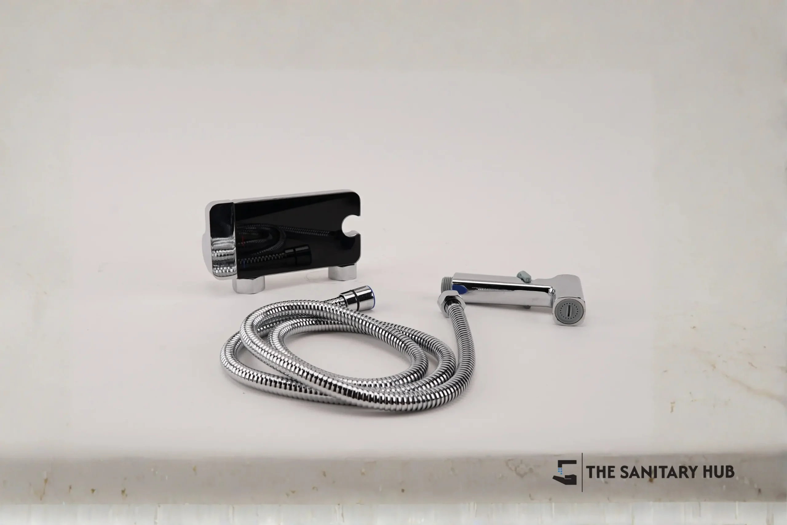 Enhance your bathroom with this digital bidet mixer set, designed for precise water control, modern hygiene, and long-term durability. The set features a sleek handheld bidet sprayer, a digital mixer unit, and a flexible stainless steel hose, offering both functionality and refined aesthetics.